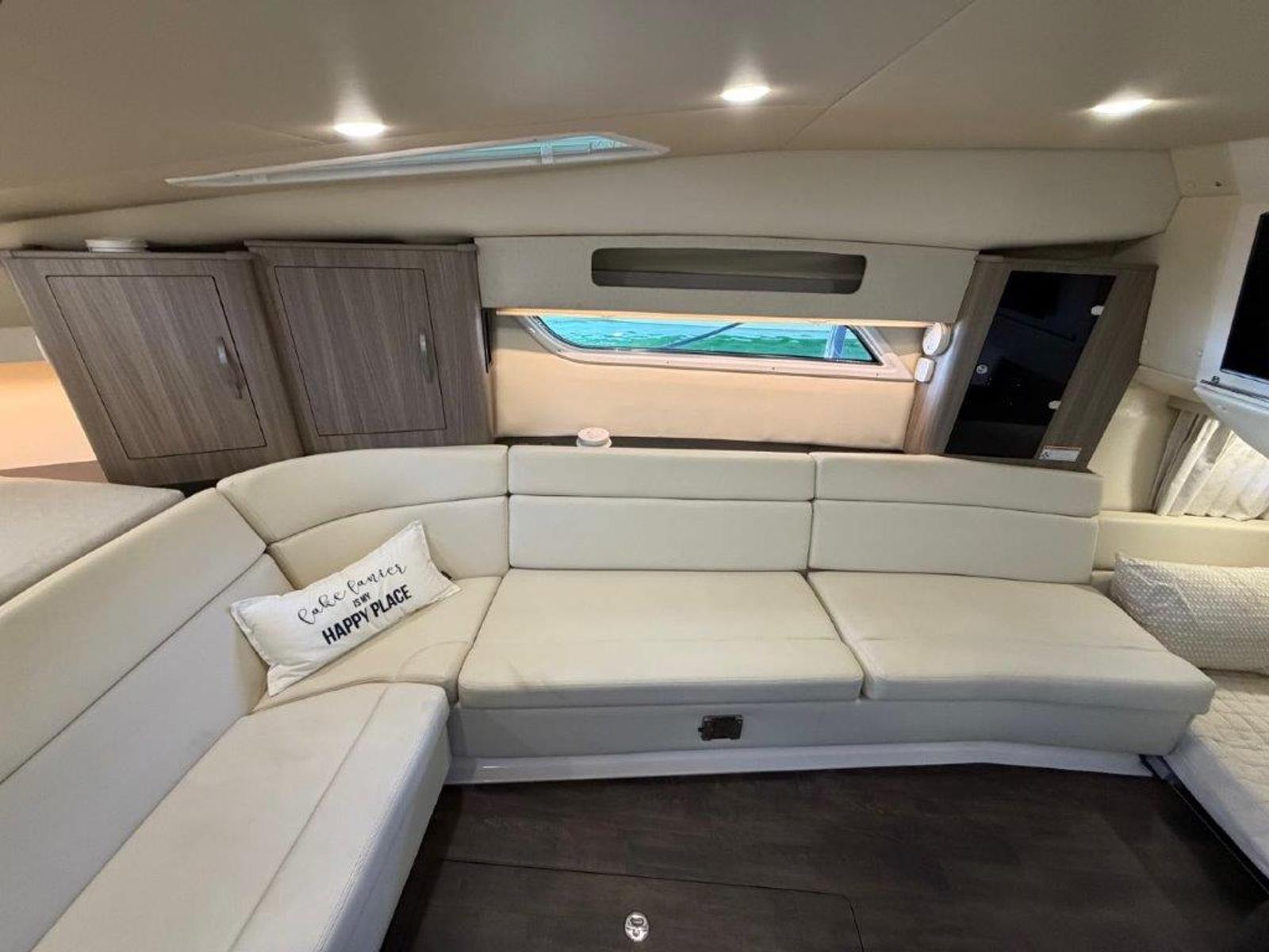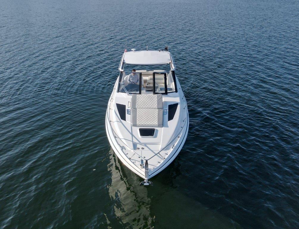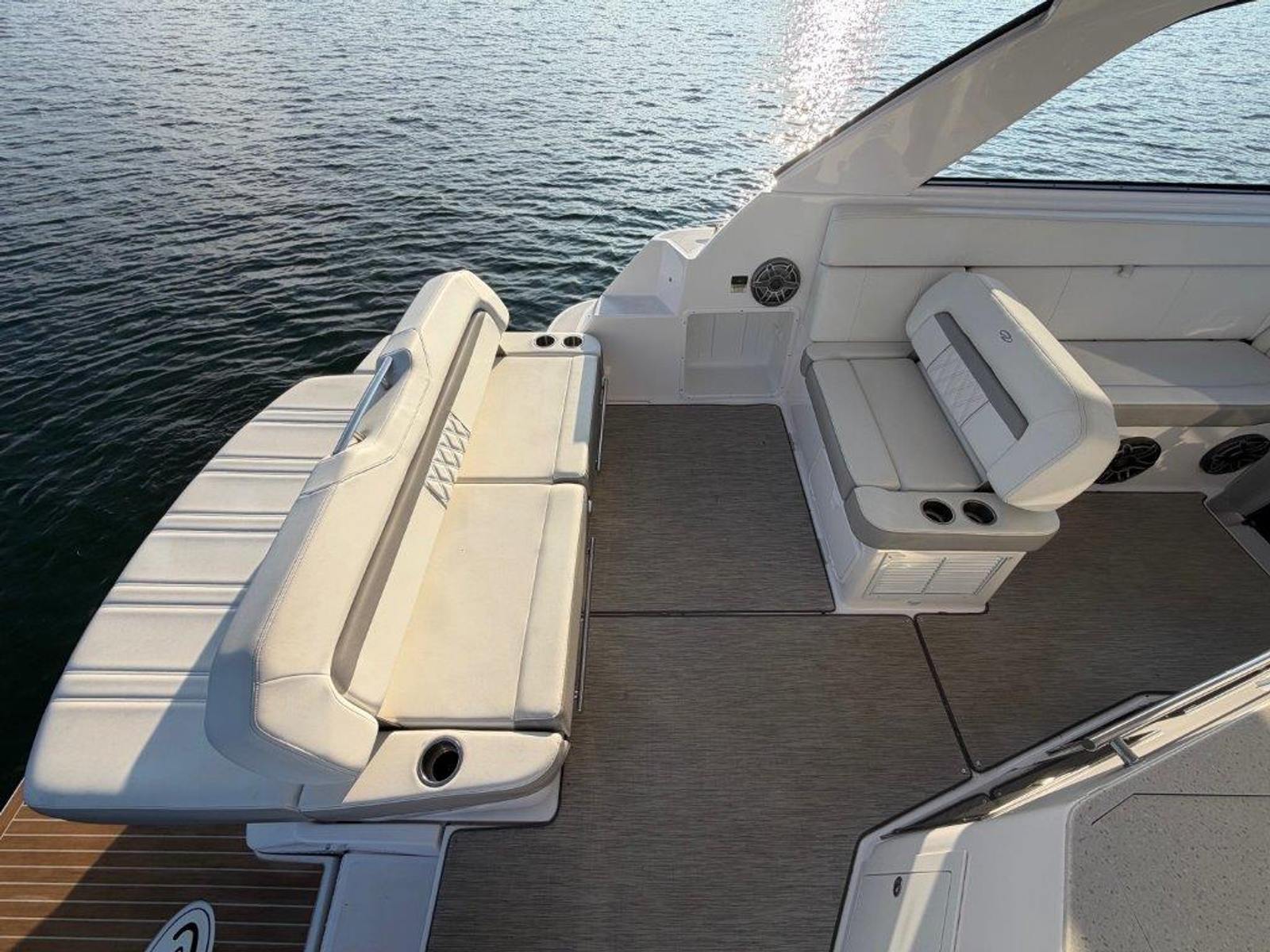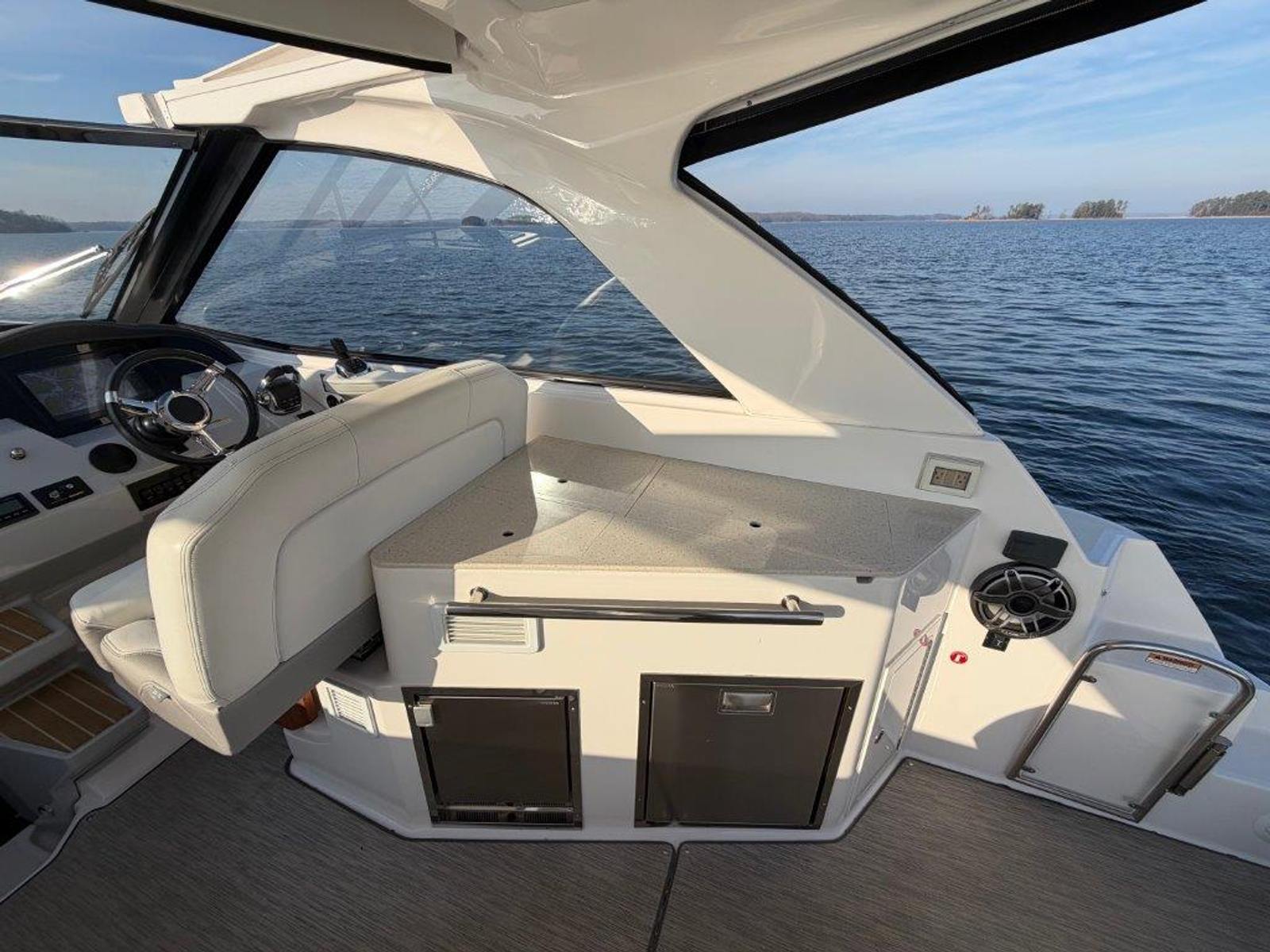 Freshwater and meticulously maintained, don’t miss your opportunity to own this beautiful 2-owner 2019 Regal 35 Sport Coupe. She’s brand new to the sales dock and ready for immediate delivery. The current owner already has his next boat picked out and is ready to make a deal. Where sport meets luxury, the 35 Sport Coupe is fast, agile, and effortless to dock with Volvo’s EVC Joystick. Powered by twin Volvo V8 300 DP CAT engines (130 hours) and a Westerbeke generator (75 hours), she delivers smooth cruising with a 225-mile range.