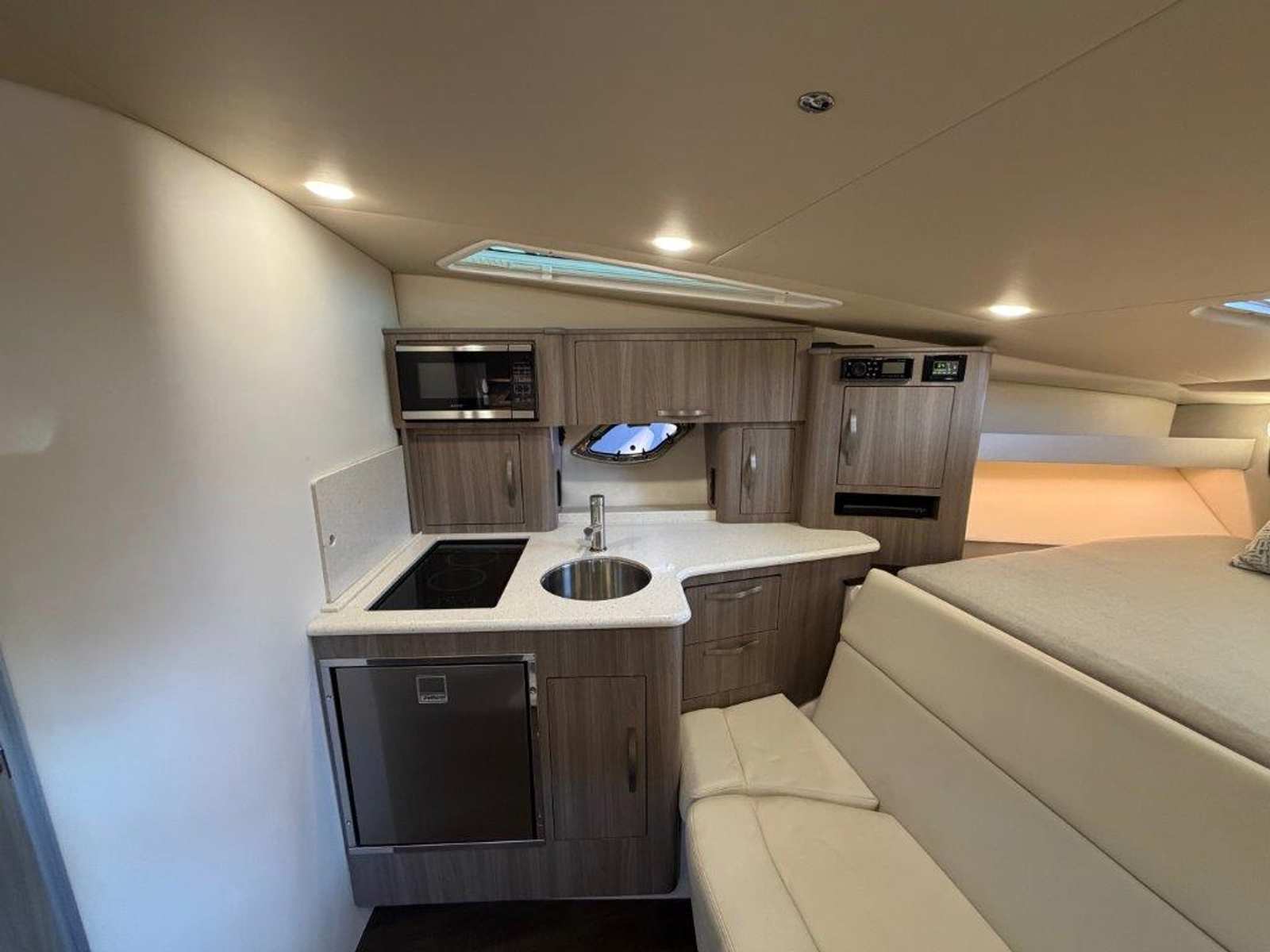Below deck, the spacious salon offers L-shaped seating for entertaining, a queen-size berth at the touch of a button, and an aft cabin that converts into a queen bed in seconds. The galley is fully equipped with a stove, microwave, and a high-gloss teak table that stores neatly behind the couch when not in use.