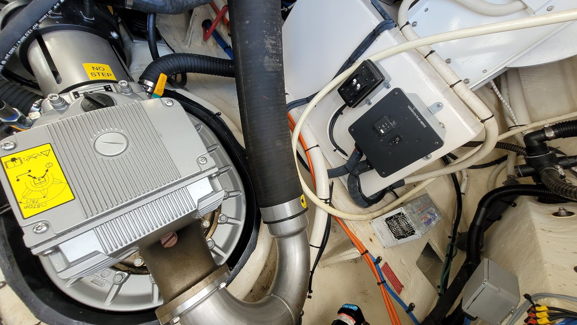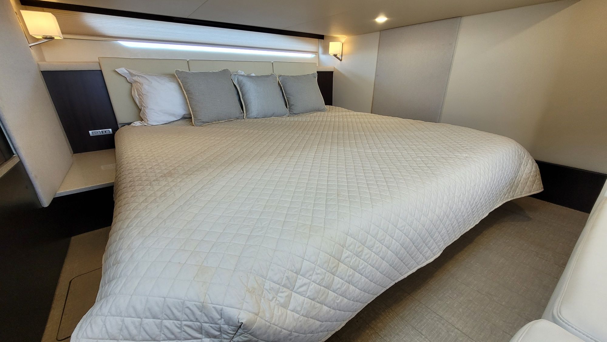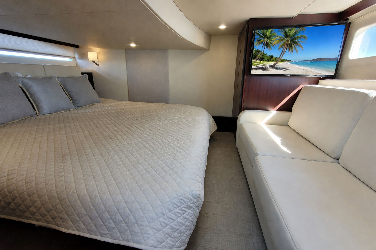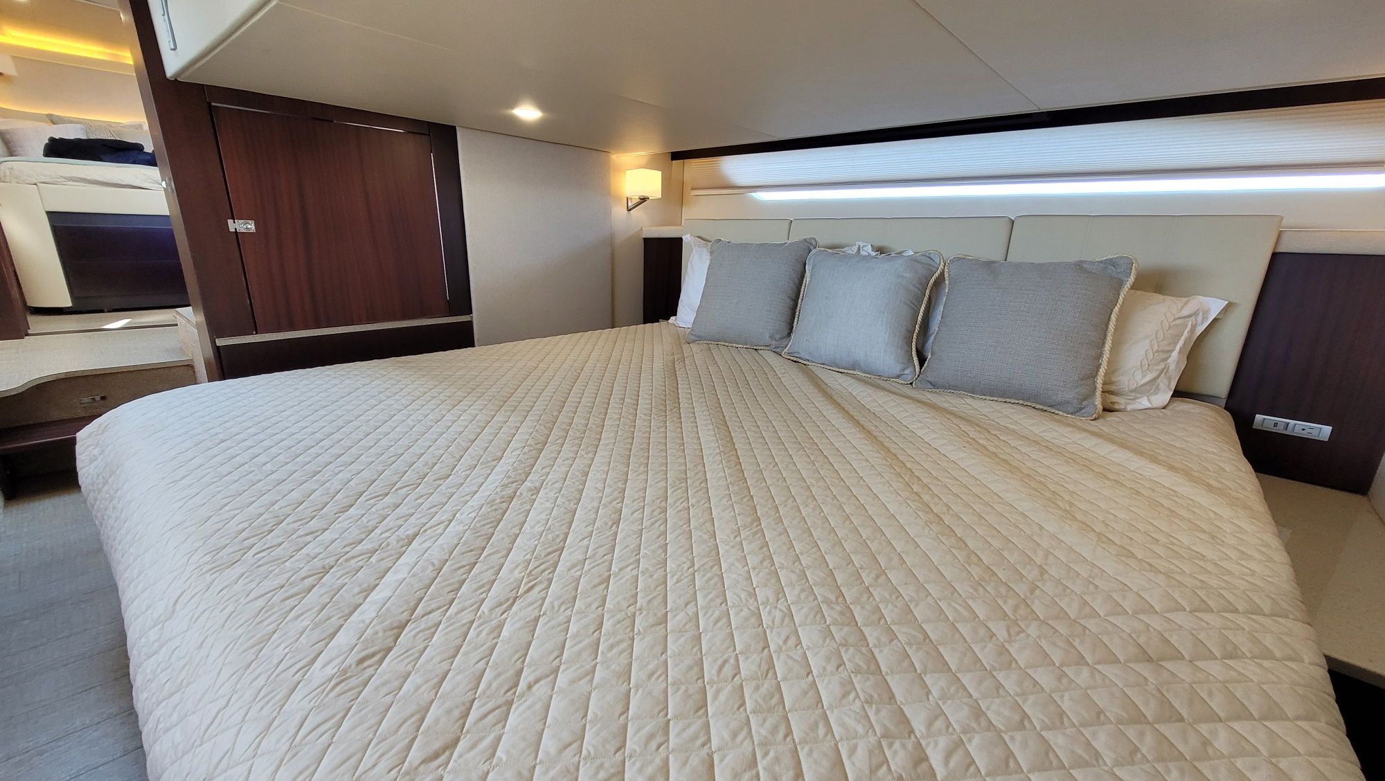 Accommodations: Below deck, the yacht features a two-stateroom layout. The forward master stateroom has an island queen bed with walk-around space, while the aft stateroom offers a large king-size bed that can be converted into twin berths.