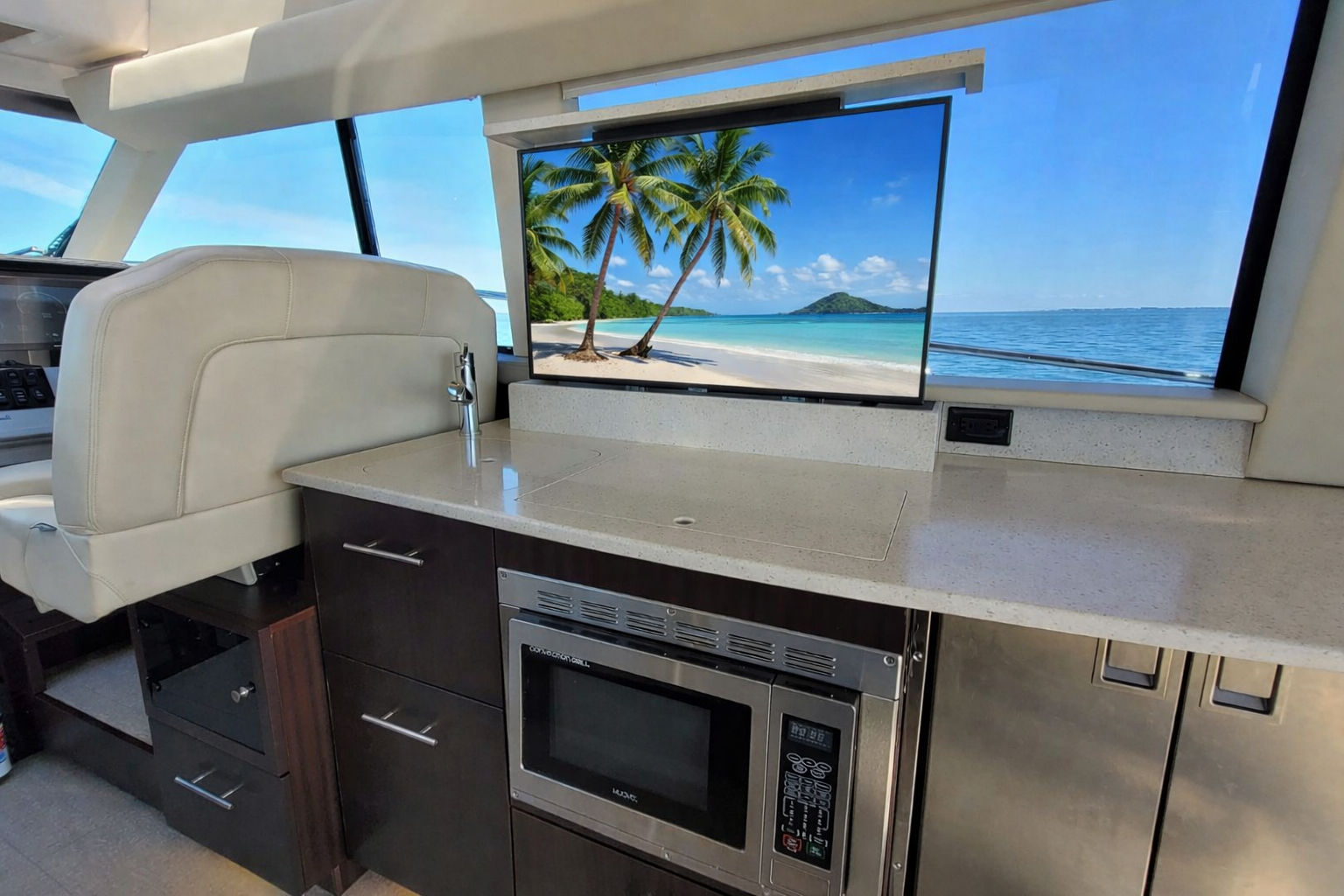 Luxurious Amenities: The boat is equipped with high-end features such as a fully-equipped galley (two-burner stove, microwave, side-by-side refrigerator/freezer), a gourmet grilling station in the cockpit, a hydraulic swim platform with a submersible step and a three-zone air-conditioning system.