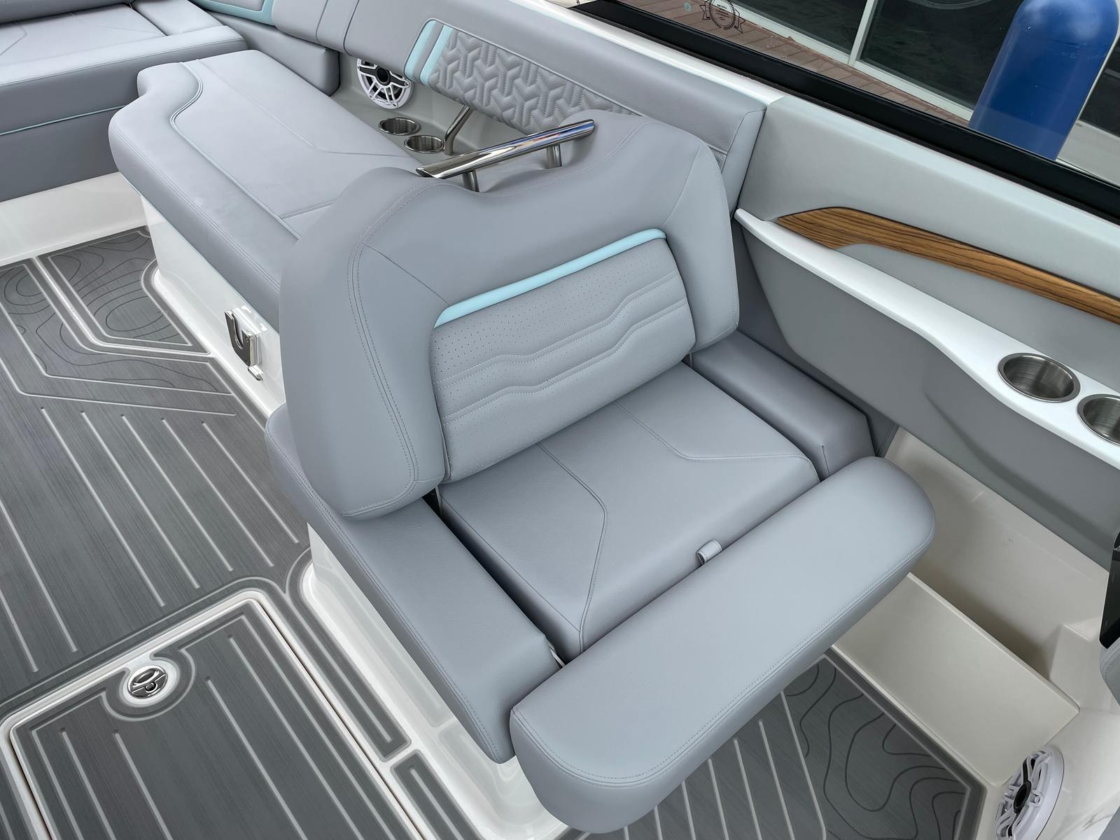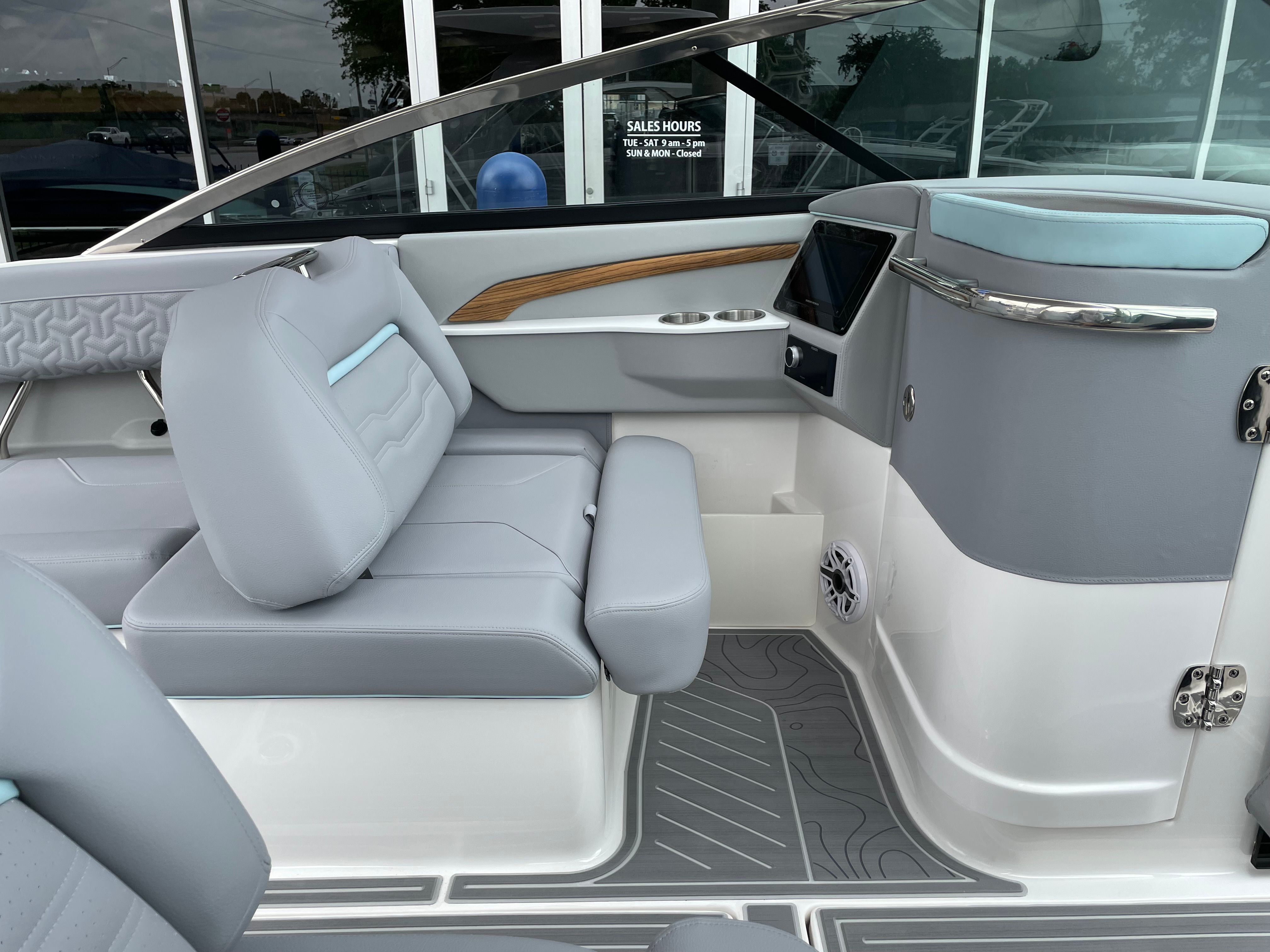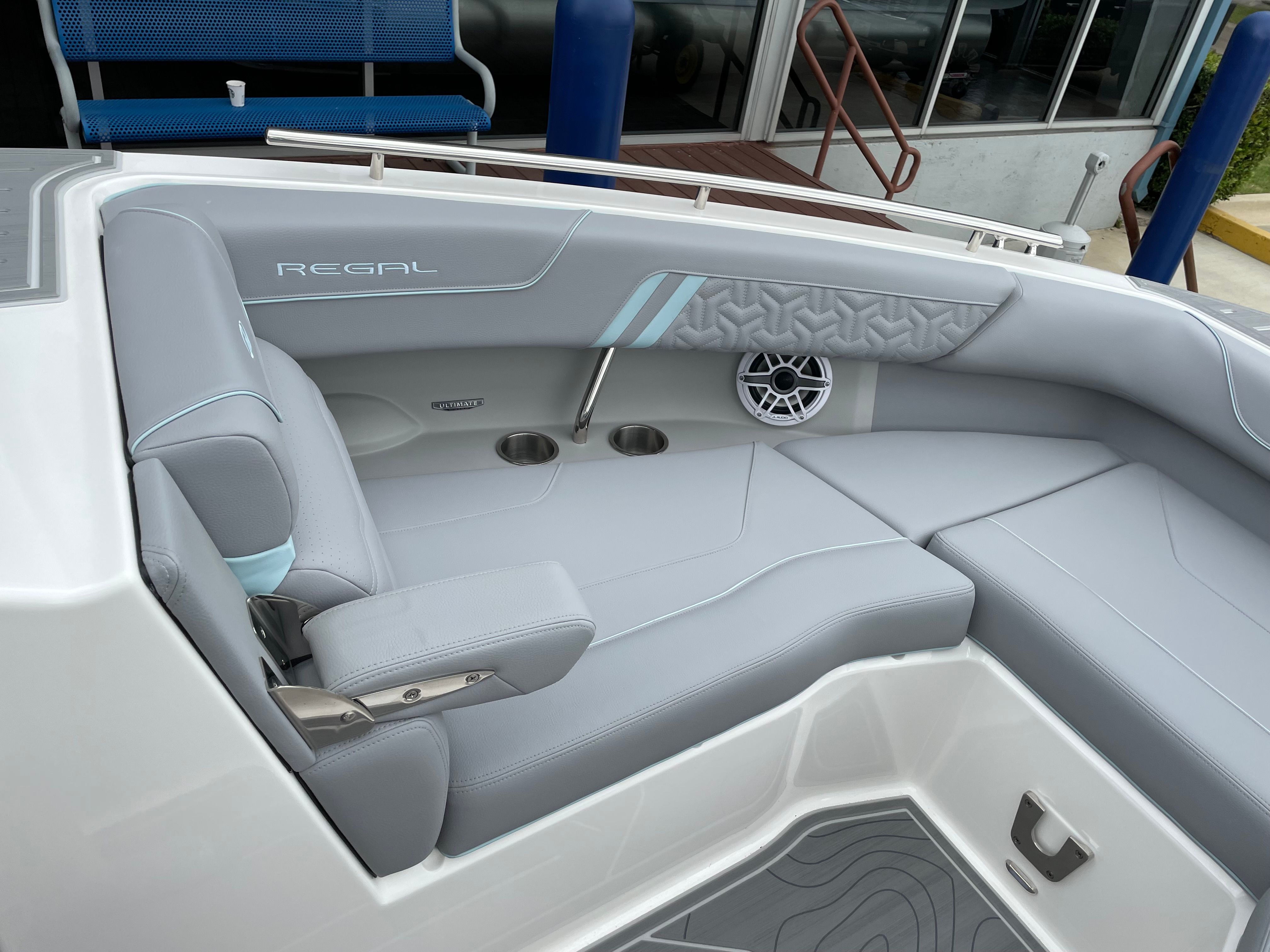 The 2026 Regal LS9 Surf Ultimate stands out as a top-tier bowrider, offering a perfect blend of sophistication and power. With a generous length of 29 feet, this new Regal boat provides ample space for friends and family to relax, socialize, and enjoy the water in style. The LS9 Surf Ultimate’s sleek lines and modern profile are accentuated by its striking hull color in Steel Grey, complemented by a Belle Isle Blue bootstripe and a Tahiti Beach White bottom. This combination not only enhances the boat’s visual appeal but also ensures you make a statement wherever you go.