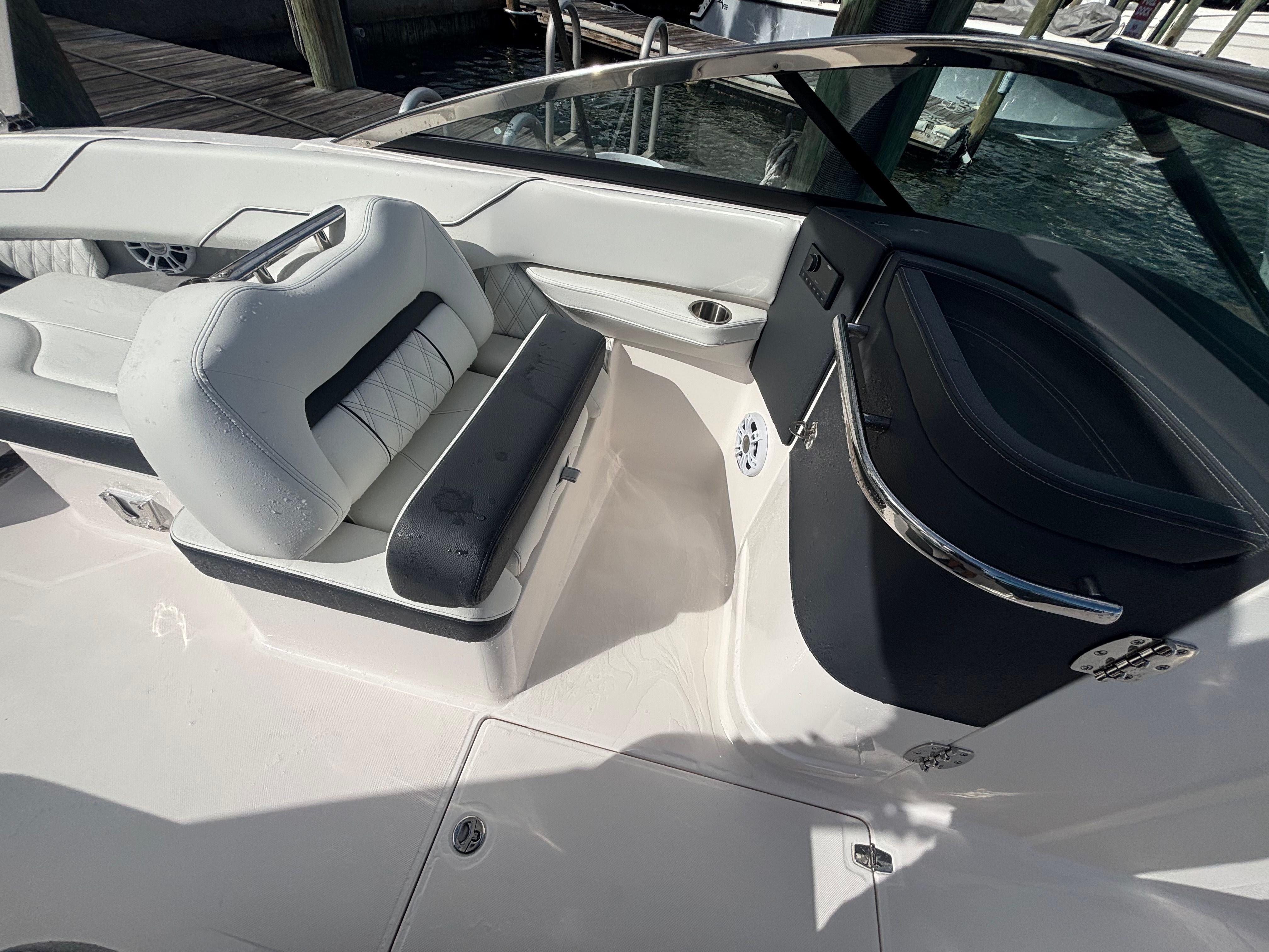 The Regal LX4 Bowrider is engineered for convenience as well as enjoyment. Fender clips simplify the docking process, reducing stress and protecting your investment. The battery charger keeps your onboard systems running smoothly, so you can focus on having fun rather than worrying about power levels.Trim tabs allow for precise adjustments to the boat’s attitude, improving fuel efficiency and ride comfort. Docking lights enhance safety during low-light conditions, making evening outings more accessible and enjoyable. The stainless steel upgrade package not only adds visual appeal but also ensures your boat remains in top condition for years to come.Storage is thoughtfully integrated throughout the LX4, providing ample space for gear, water toys, and personal items. The practical layout makes it easy to keep the deck organized and clutter-free, so you can maximize your time on the water.