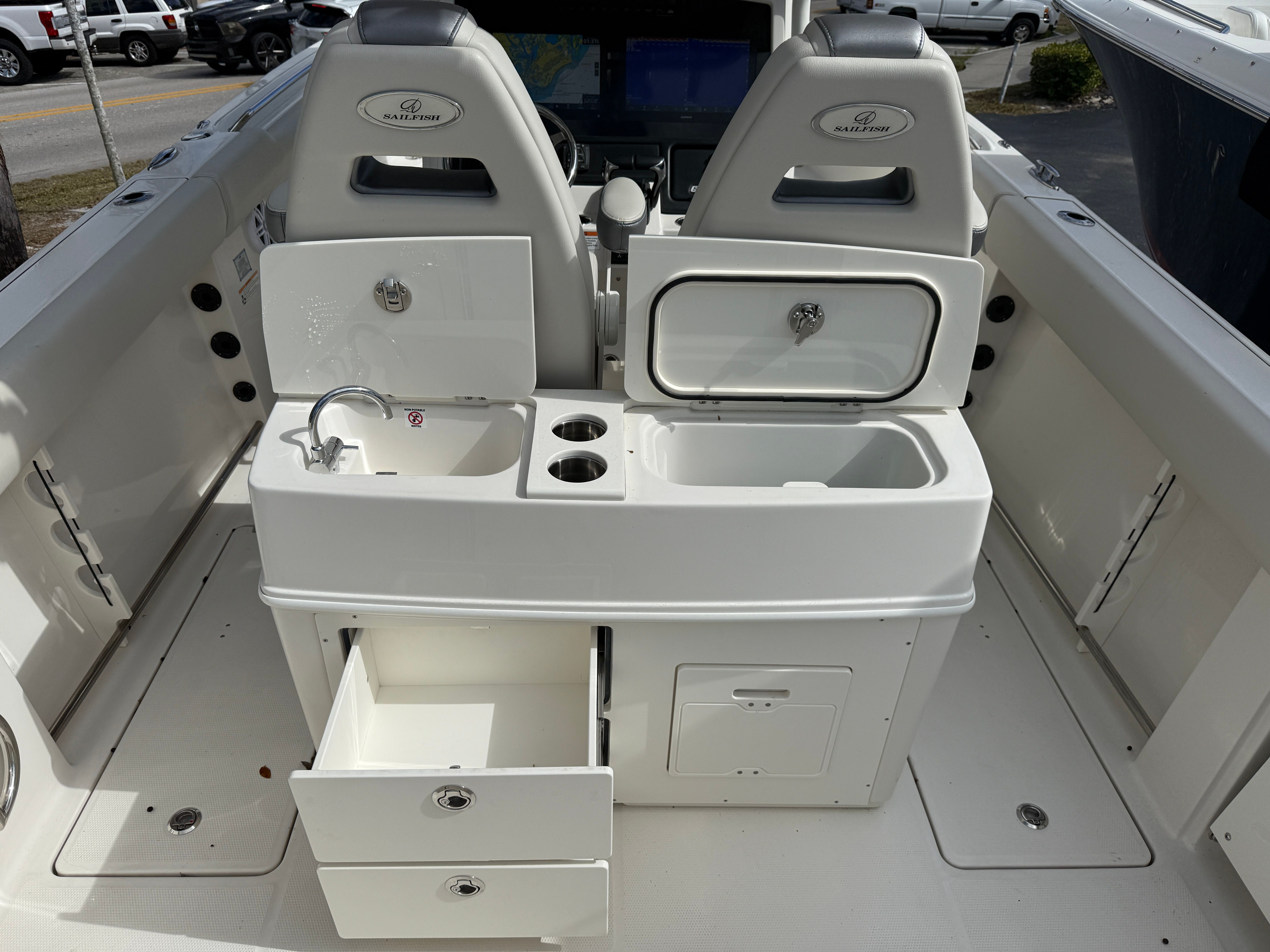 Just in on trade! 2025 Sailfish 272 with twin Yamaha 250's with only 34 hours and Warranty until 02/26/2031!!!! LIKE NEW!