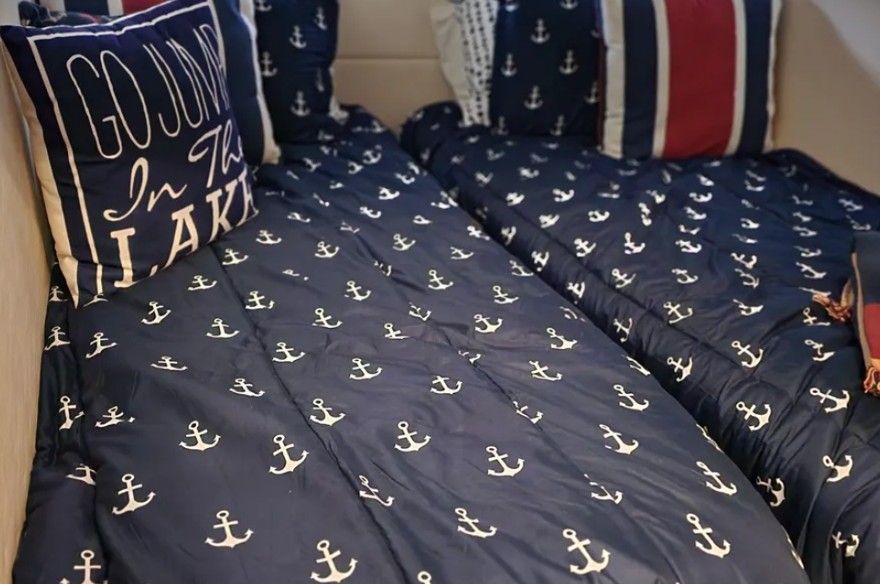 The galley is fully equipped for extended stays, featuring a two-burner stove, microwave/oven combo, oversized sink, Corian countertops, abundant cabinetry and drawers, and a new full-size refrigerator and freezer. The interior layout offers two staterooms and two heads. The master suite includes a queen berth with upgraded gel topper, dual cedar-lined closets, and a private head with separate shower and vanity. The guest stateroom features a convertible twin-to-queen berth, private head with shower and sink, a closet, and ample storage.