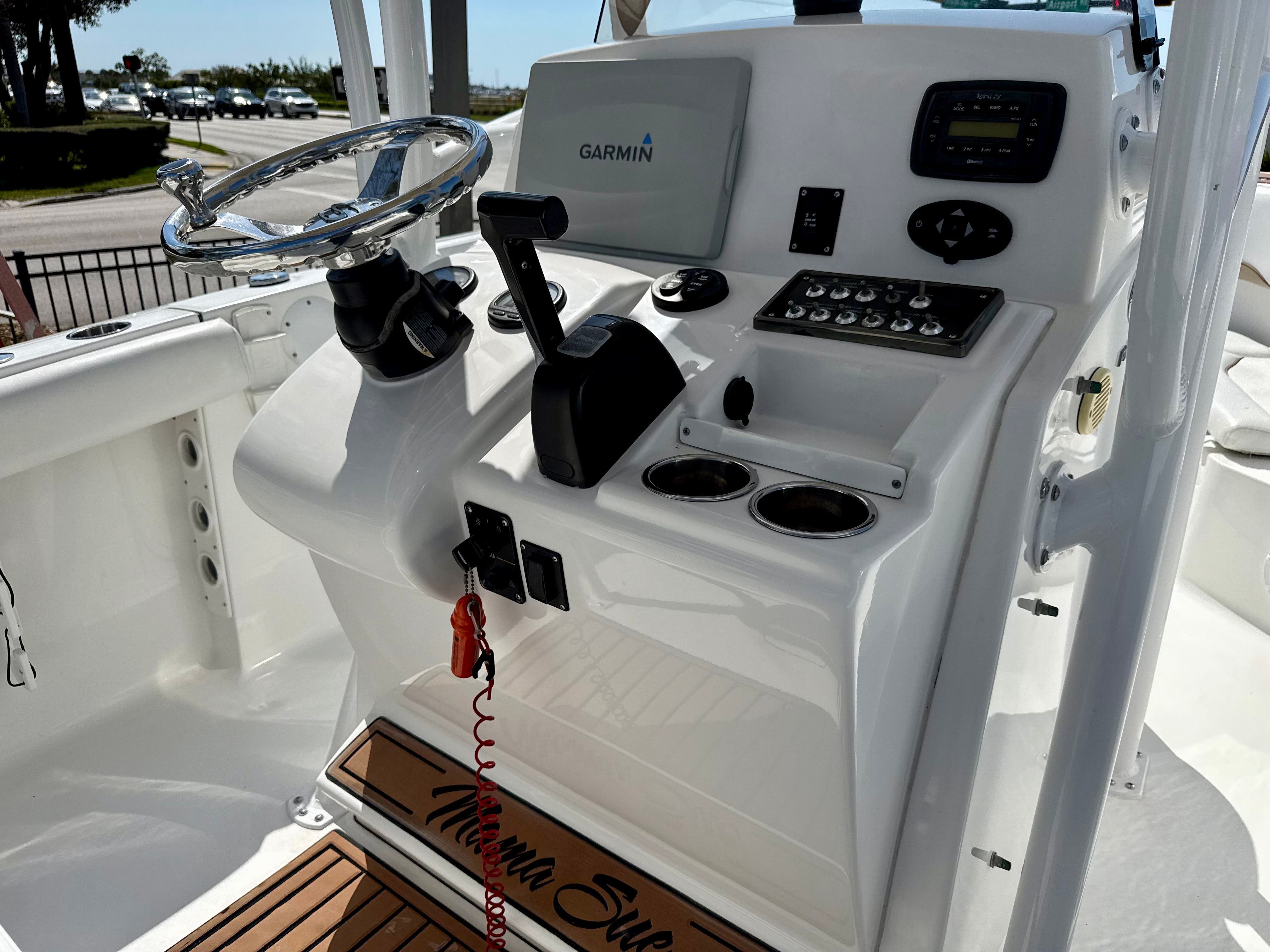 At the helm, you’ll find a Garmin 12-inch navigation display with sonar, providing clear, easy-to-read charting and fish-finding capabilities, along with a Garmin dome radar to enhance visibility and safety when navigating in low-light or changing weather conditions. The boat is also equipped with a jackplate, allowing for improved performance, shallow-water capability, and fine-tuned trim while underway.