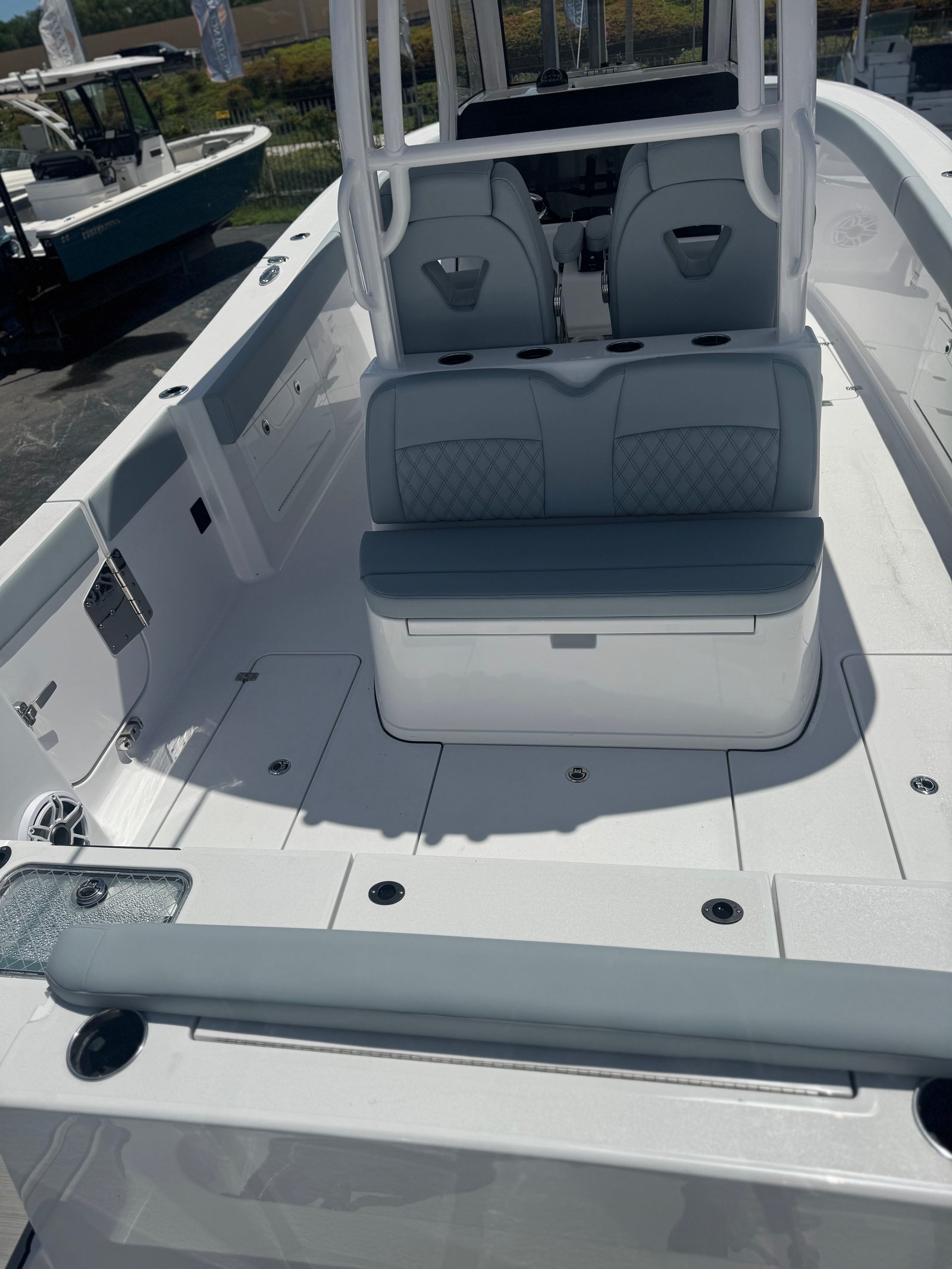 Step aboard the Sportsman Heritage 321 and discover a host of premium features designed to maximize comfort, convenience, and enjoyment. The fiberglass console with FG liner and cooler seat offers a practical and stylish command center, while the fiberglass hardtop with integrated LED lighting ensures you’re ready for day or night adventures. The hardtop’s underside and powder coating are finished in crisp white, complementing the boat’s overall aesthetic.The Serenity Sileather Smoky Gray upholstery adds a touch of luxury and durability, providing plush seating throughout the vessel. The fiberglass leaning post with a rear-facing seat and sink is perfect for entertaining or prepping your catch of the day. Dual captain chairs offer ergonomic support for long journeys, and the inclusion of two Garmin 16-inch GPS screens with built-in Wi-Fi puts advanced navigation and connectivity at your fingertips.