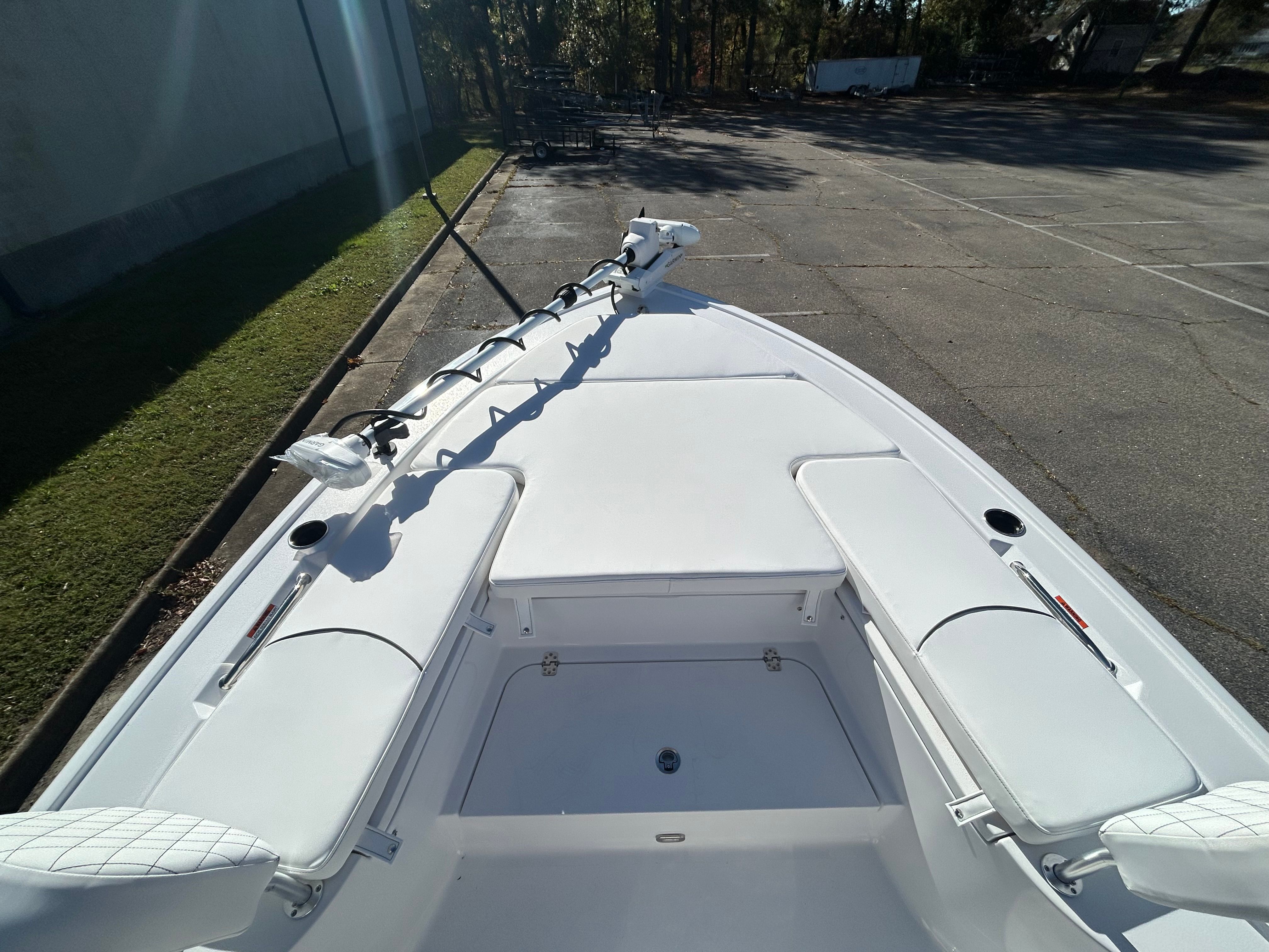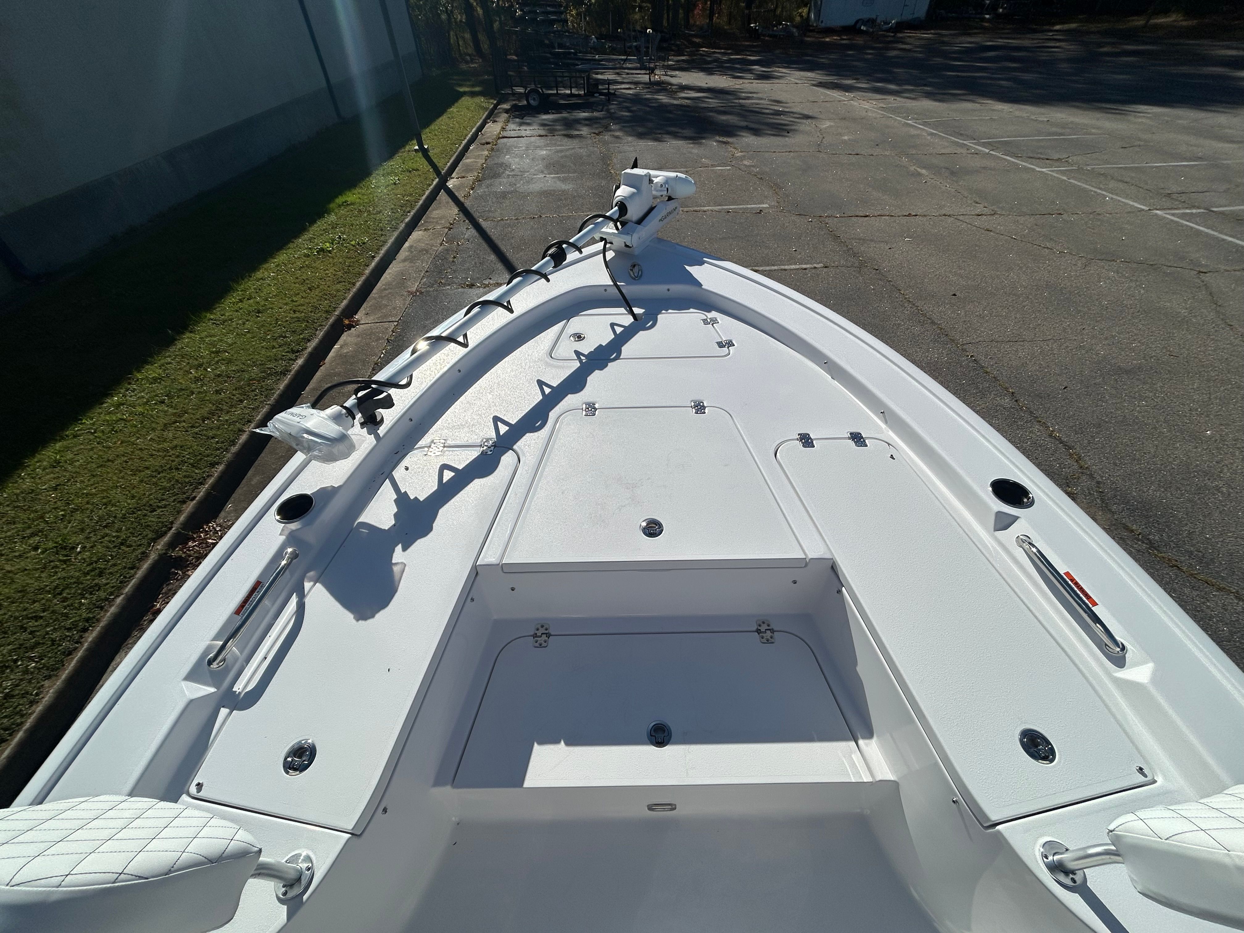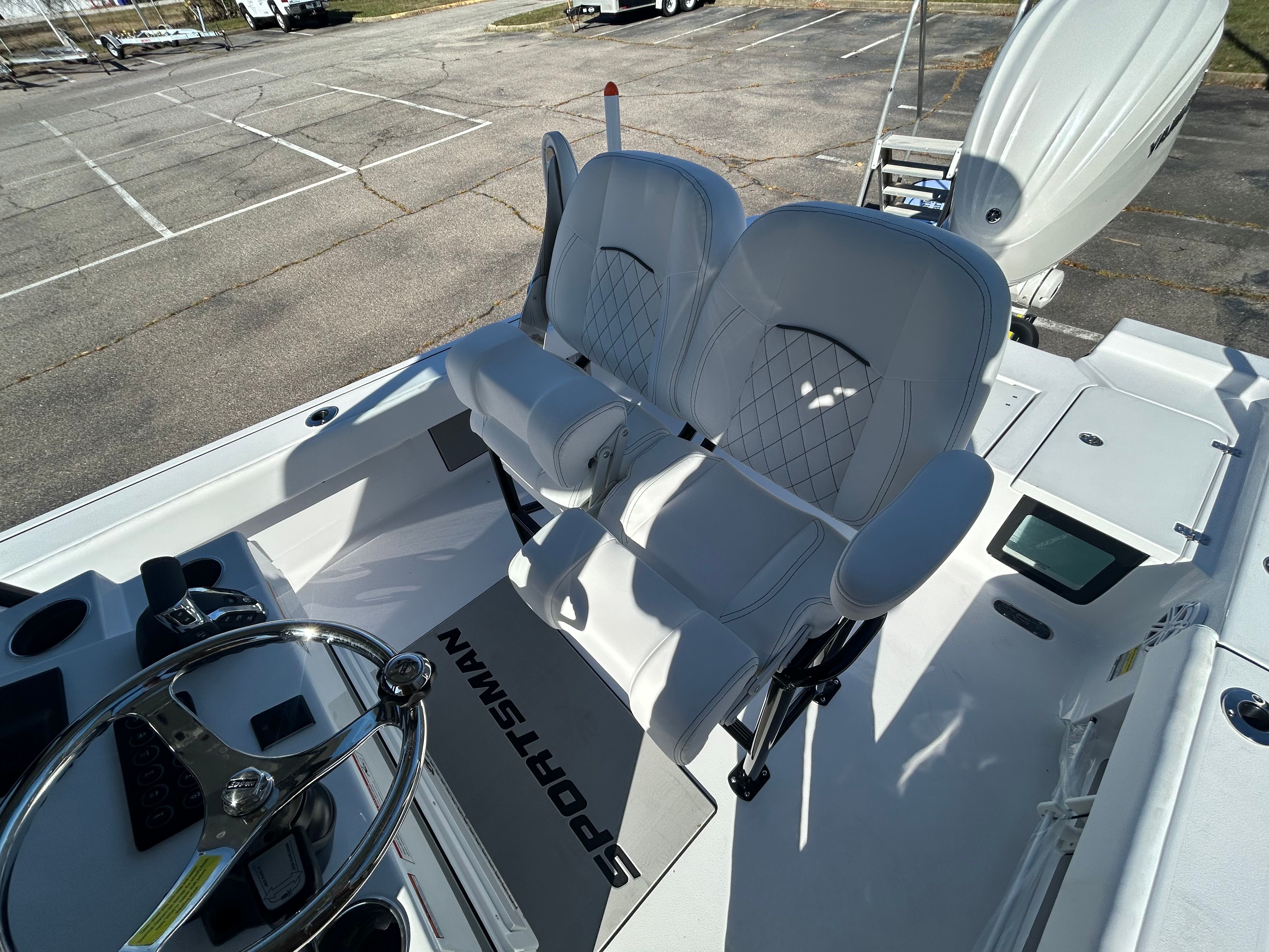 The Sportsman Masters 247 is loaded with features designed to enhance your boating experience. The Bow Cushion Set and Sundeck provide a comfortable space for relaxation and sunbathing, while the Removable Bow Backrest with Seat Cushions offers flexible seating options for guests. The Edson 13” Stainless Steel Comfort Grip Steering Wheel with PowerKnob delivers precise control and effortless maneuvering, making every trip enjoyable for the captain.For anglers, the Garmin Force Kraken Trolling Motor (75", White) offers advanced navigation and positioning, allowing you to fish with precision and ease. The ProMariner ProTournament Elite 3 Battery Charger (2-Bank) ensures your electronics and trolling motor stay powered throughout the day, so you can focus on the fun without worry. Under the leaning post, you’ll find convenient tackle storage, keeping your gear organized and within reach.The Shadow Gray hull and Icecap White upholstery not only look fantastic but are also designed for durability and easy maintenance. Every detail of the Masters 247 reflects Sportsman’s commitment to quality and innovation.