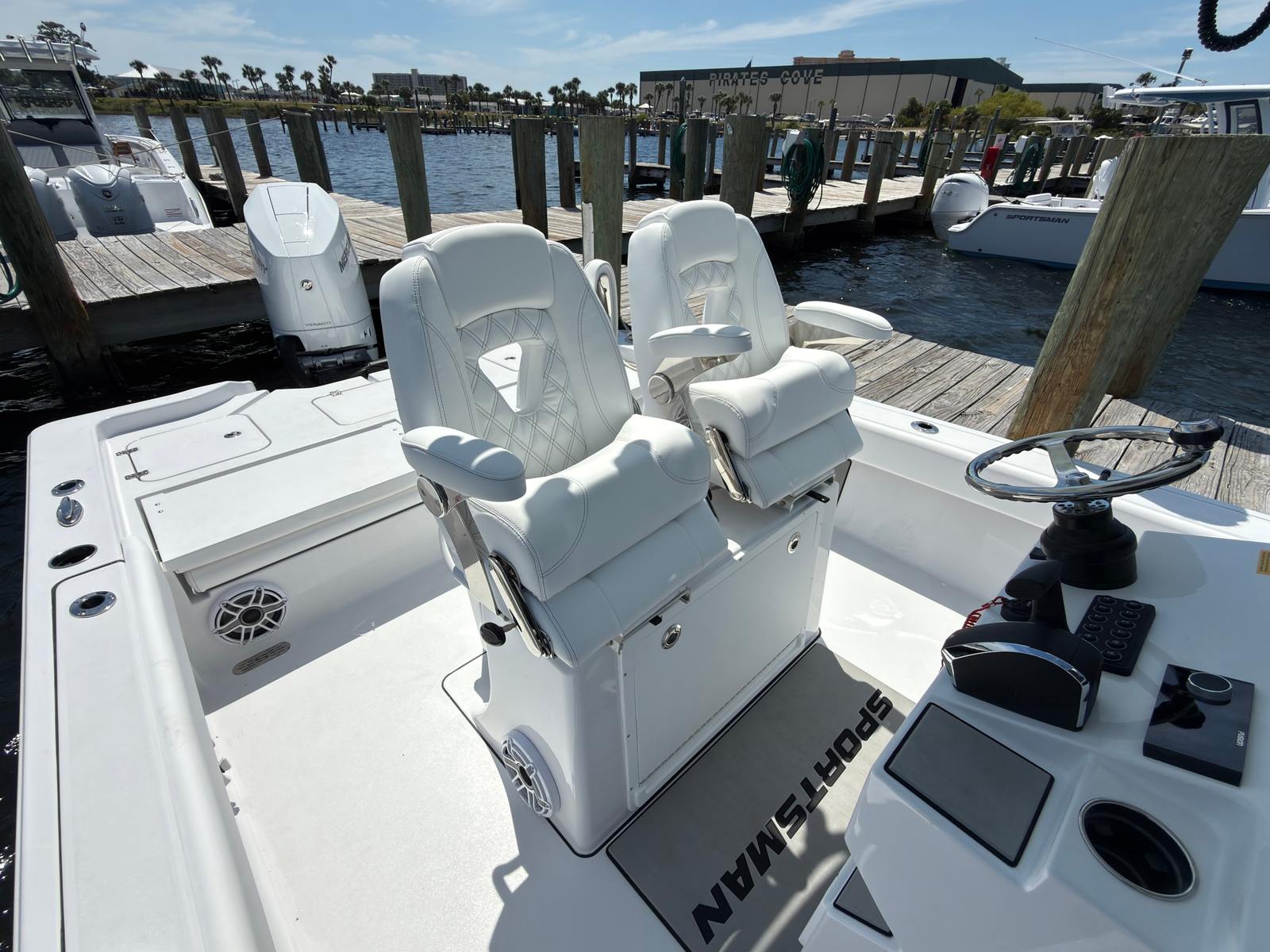 Powering the Sportsman Masters 267 is a single Mercury 400 V10 engine in a brilliant white finish, delivering an impressive 400 horsepower. This powerhouse of an engine ensures exhilarating acceleration, smooth cruising, and reliable performance whether you’re navigating tight channels or heading offshore. The advanced engineering of the Mercury V10 provides not only raw power but also enhanced fuel efficiency and quiet operation, allowing you to enjoy longer days on the water with less noise and fewer stops at the fuel dock. The responsive handling and precision steering, aided by the Edson 13” stainless steel comfort grip steering wheel with PowerKnob, make piloting this bay boat a true pleasure, even in challenging conditions.