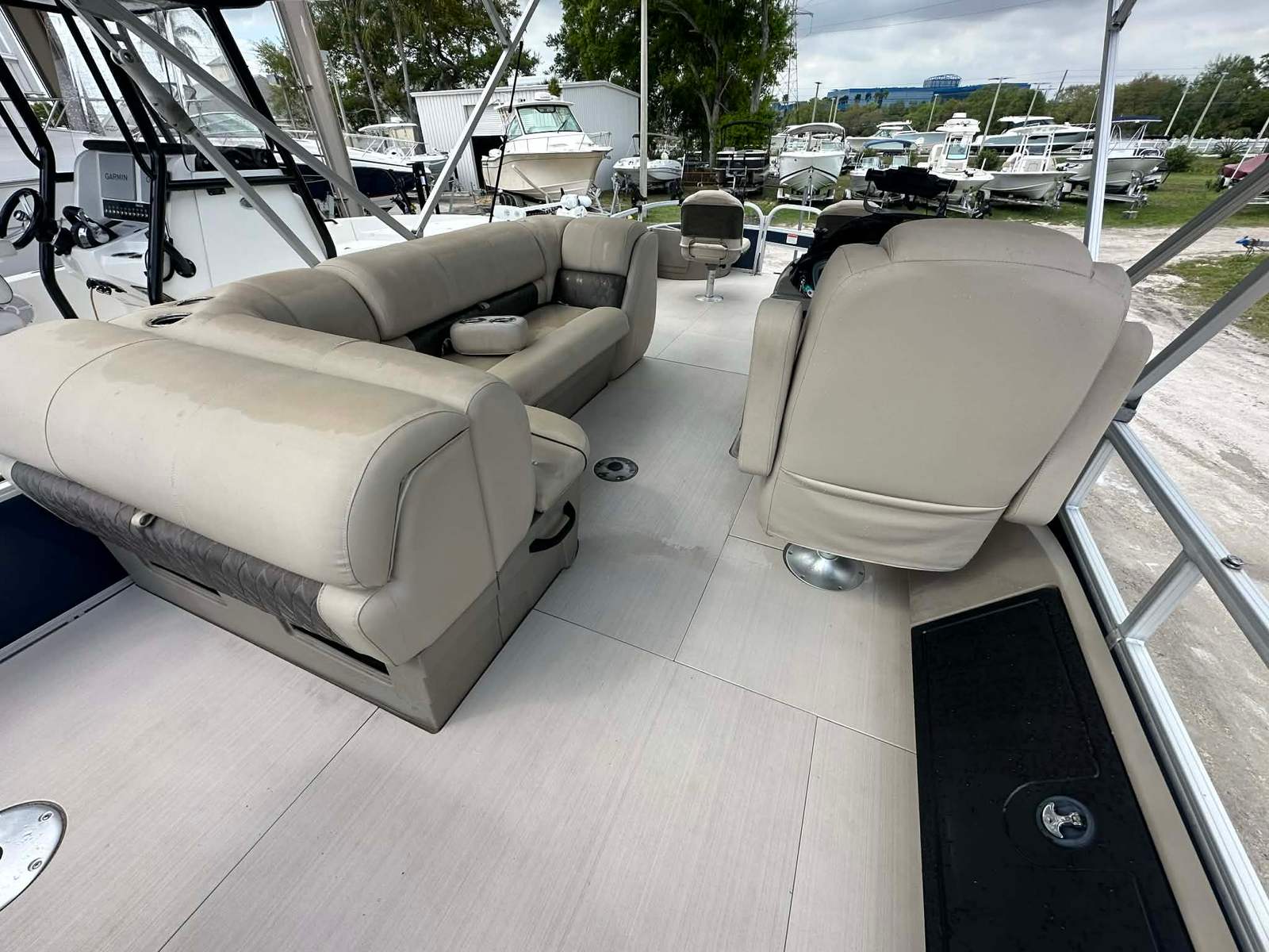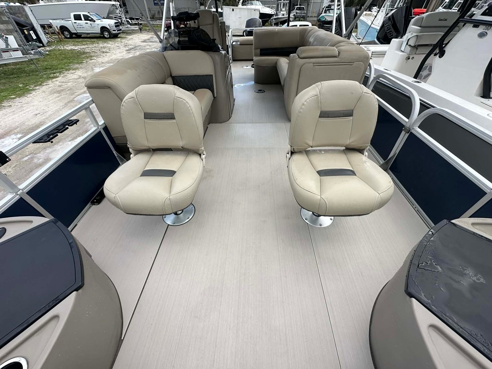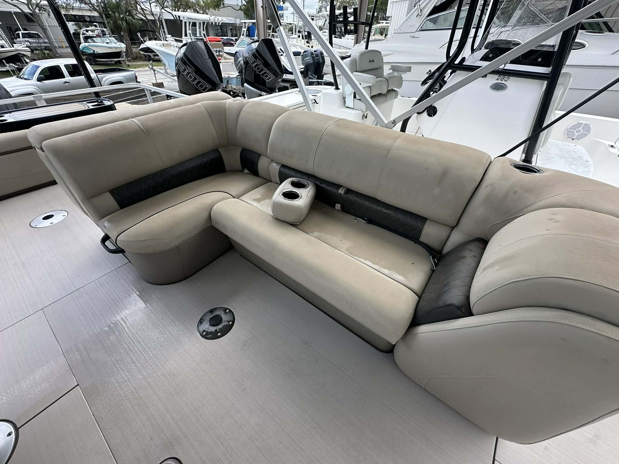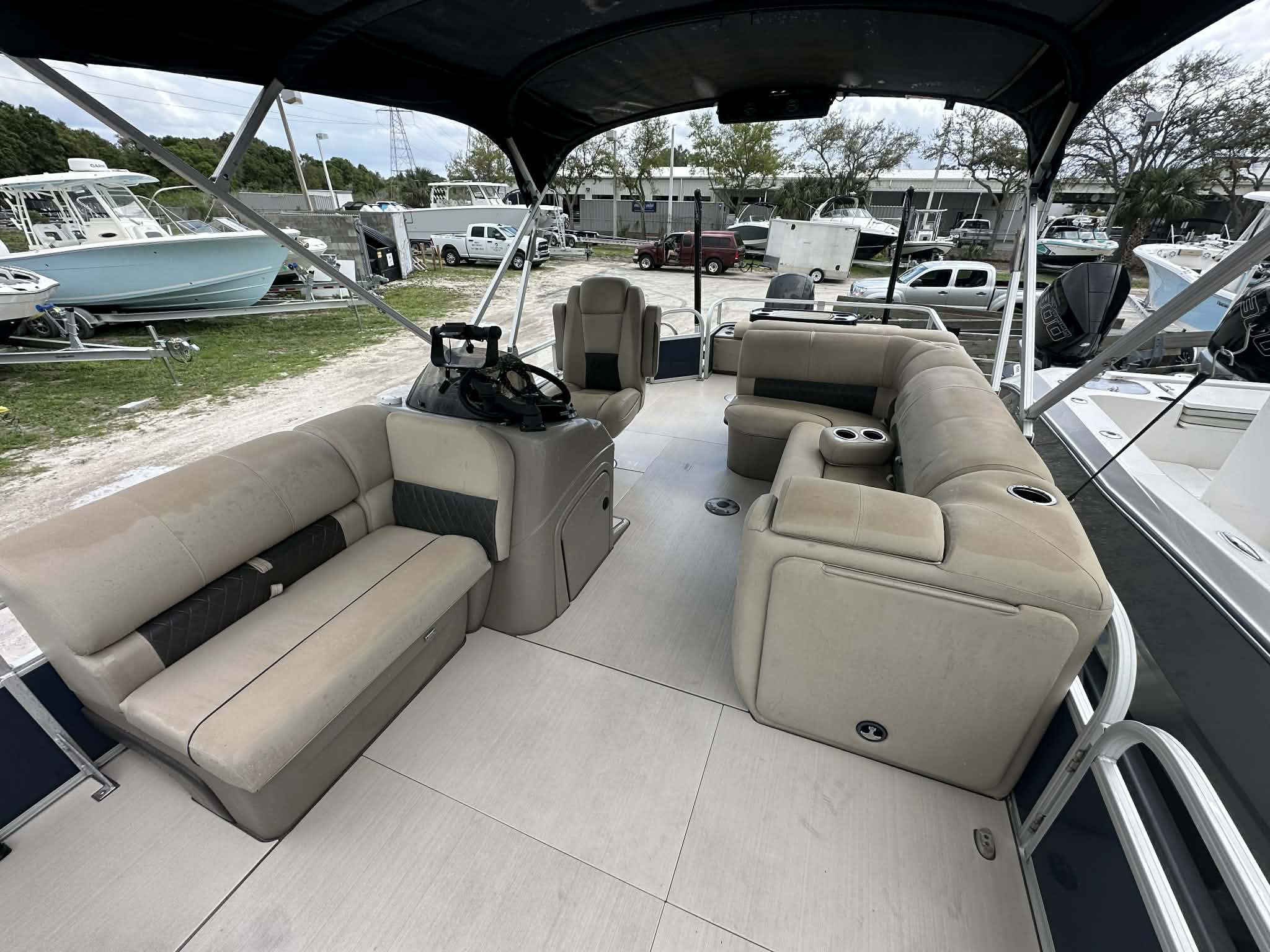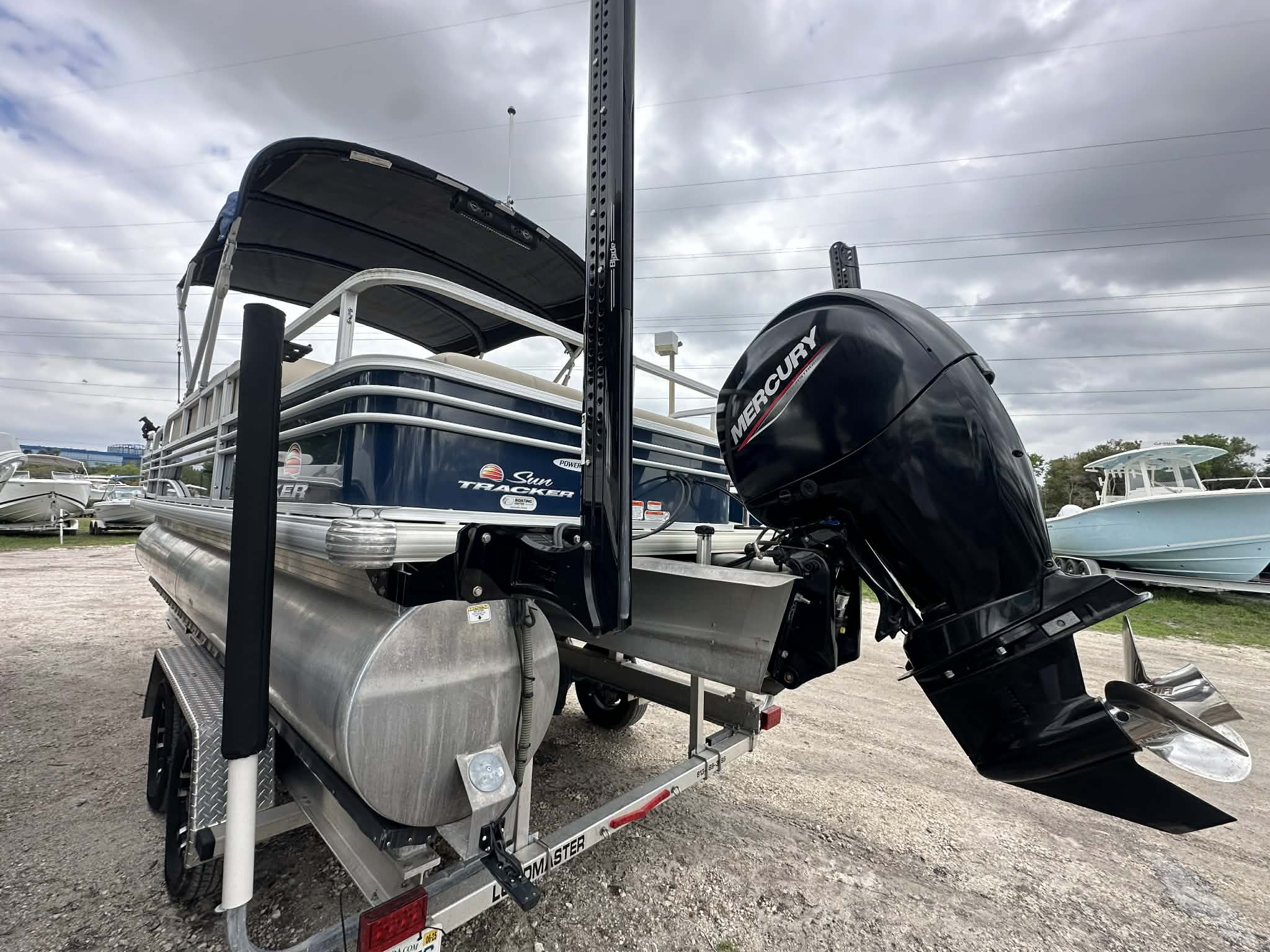 The SunTracker Fishin’ Barge 22 XP3 is the perfect combination of family cruising and serious fishing capability. Built on Tracker’s XP3 performance tritoon package, this boat delivers improved stability, speed, and handling compared to traditional pontoons. Powered by a Mercury 150HP outboard with only 80 hours, it has plenty of power for cruising, pulling tubes, or running to your favorite fishing spots.